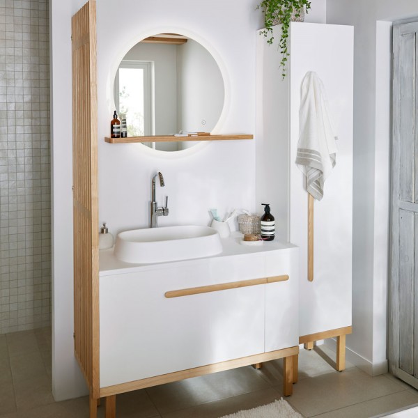- Mueble Adriska al suelo blanco: este conjunto incluye un mueble de baño de 100 cm de ancho, un lavabo de resina y un espejo con estante y luz led integrada. El mueble se apoya sobre cuatro patas de madera natural, material del que también están hechos los tiradores y el estante del espejo.