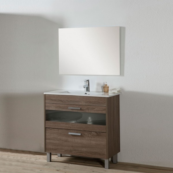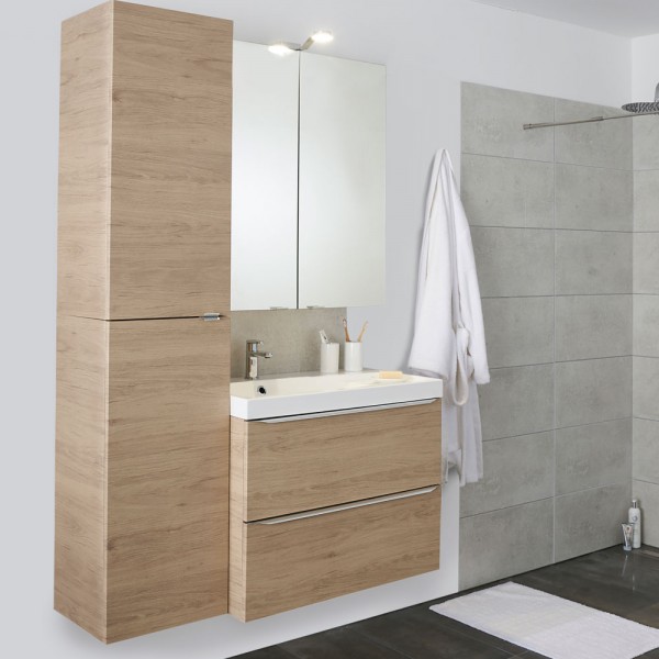 - Conjunto Imandra: la serie Imandra es la que ofrece más posibilidades, con muebles bajo lavabo, suspendidos, columnas y colgados en diversos colores y medidas (60, 80, 100 y 120 centímetros de ancho). Este conjunto de color roble incluye un mueble suspendido de 60 centímetros de ancho, un lavabo de resina, un mueble auxiliar con puertas de espejo y una columna suspendida.