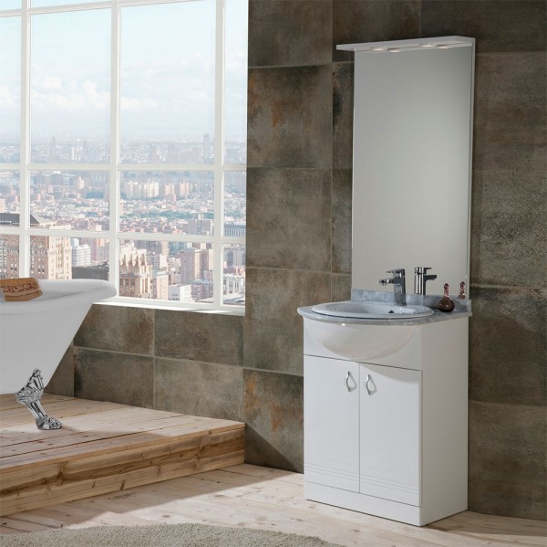 - Conjunto de baño Córdoba: está disponible en anchos de 60, 80 y 100 centímetros. El conjunto incluye un mueble, un lavabo cerámico, un espejo y una encimera de mármol. Tanto el acabado del mueble como de la encimera siguen el estilo de los baños más clásicos.
