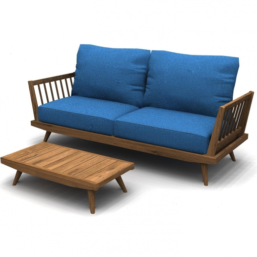- Conjunto de mesa y sofá Jersey: para tomar el aire y descansar un rato al sol qué mejor que un cómodo sofá acompañado de una mesita en la que colocar la bebida. Este conjunto está fabricado en madera de teca e incluye una funda de cojín de repuesto en color azul.