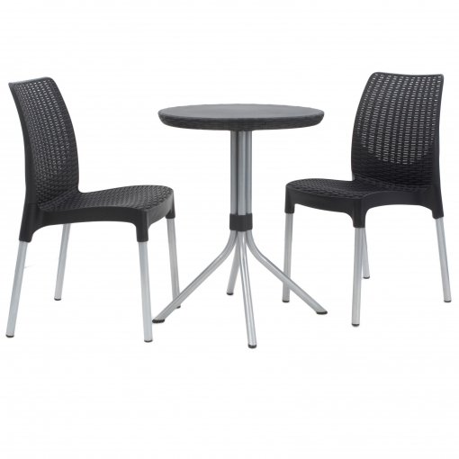 - Set de grafito de mesa con 2 sillones Chelsea: en pequeñas terrazas que no pueden albergar grandes muebles se puede optar por un conjunto más pequeño como este, en el que la mesa mide 87 centímetros de ancho y 48 de largo. Todo el conjunto está fabricado con resina.