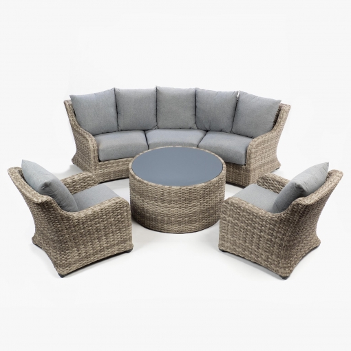 - Rinconera curva con mesa, 2 sillones y sofá Sean: para jardines amplios y con un estilo más moderno este conjunto de sofás es ideal. Sus muebles están elaborados con una estructura de acero y fibra sintética trenzada a mano. La mesa de centro cuenta además con un cristal tintado de 5 mm. Su gran cantidad de asientos permite disfrutar de largas veladas en compañía.