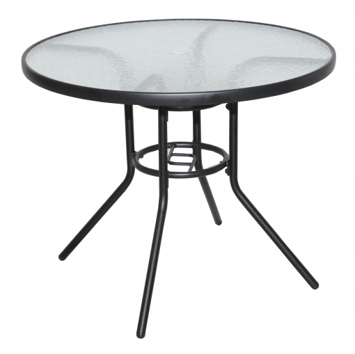 - Mesa de cristal redonda Negro: elaborada con acero, esta mesa con superficie de cristal mide 90×72 centímetros. La superficie incluye un agujero para introducir la sombrilla, de manera que se pueda utilizar aun cuando haga sol.