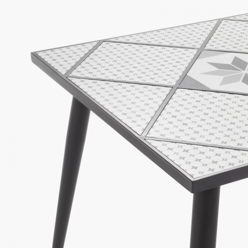 - Mesa forja de azulejos: esta mesa rectangular mide 179 centímetros de largo y 90 de ancho, lo que permite que se sienten alrededor bastantes personas. Su superficie con acabado de azulejos le aporta un toque clásico al jardín o terraza.