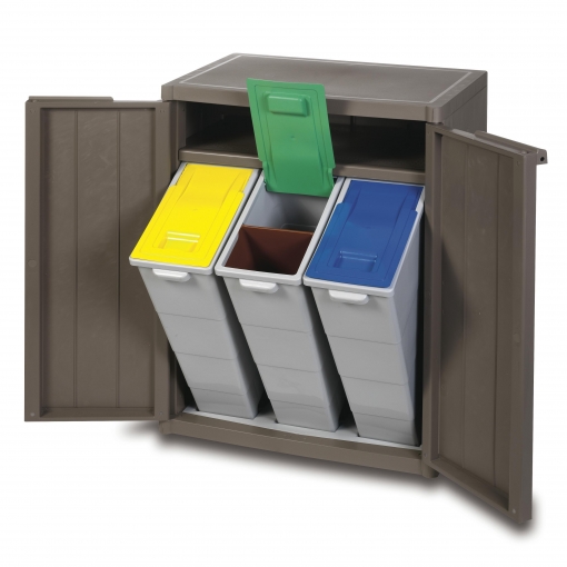 - Armario bajo para reciclaje: la falta de espacio dentro de casa para tirar la basura no será un problema gracias a este armario. En su interior guarda tres cubos con tapas de colores para reciclar los diferentes residuos. Su balda aguanta hasta 20 kilogramos.