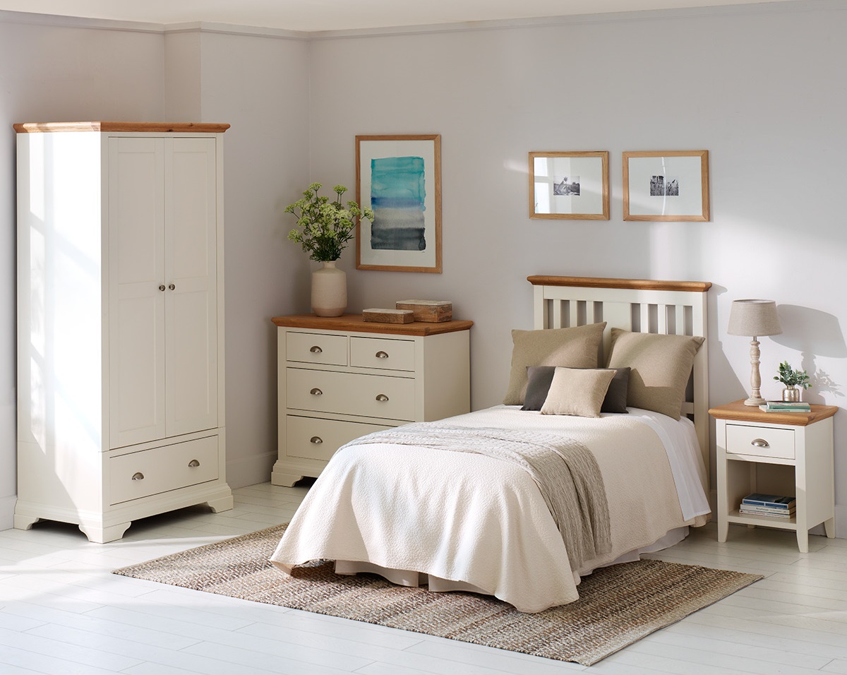 7. Dormitorio juvenil Hamstead: combina el color blanco y roble en todas sus piezas para crear un estilo provenzal y clásico. Dentro de esta colección se incluyen una mesita de noche, un armario, un sifonier, una cómoda y un cabecero a rayas tanto individual como doble.