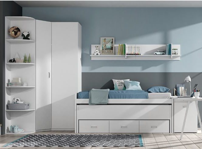 3. Dormitorio juvenil Planet con cama compacta de nido oculto en blanco ártico: también de la línea Planet, este dormitorio incluye un armario en esquina, ideal para aprovechar al máximo habitaciones pequeñas. En este caso la cama nido es oculta, ya que el colchón de abajo no se puede ver cuando está guardado. Al armario se le puede añadir una esquina rinconera reversible.