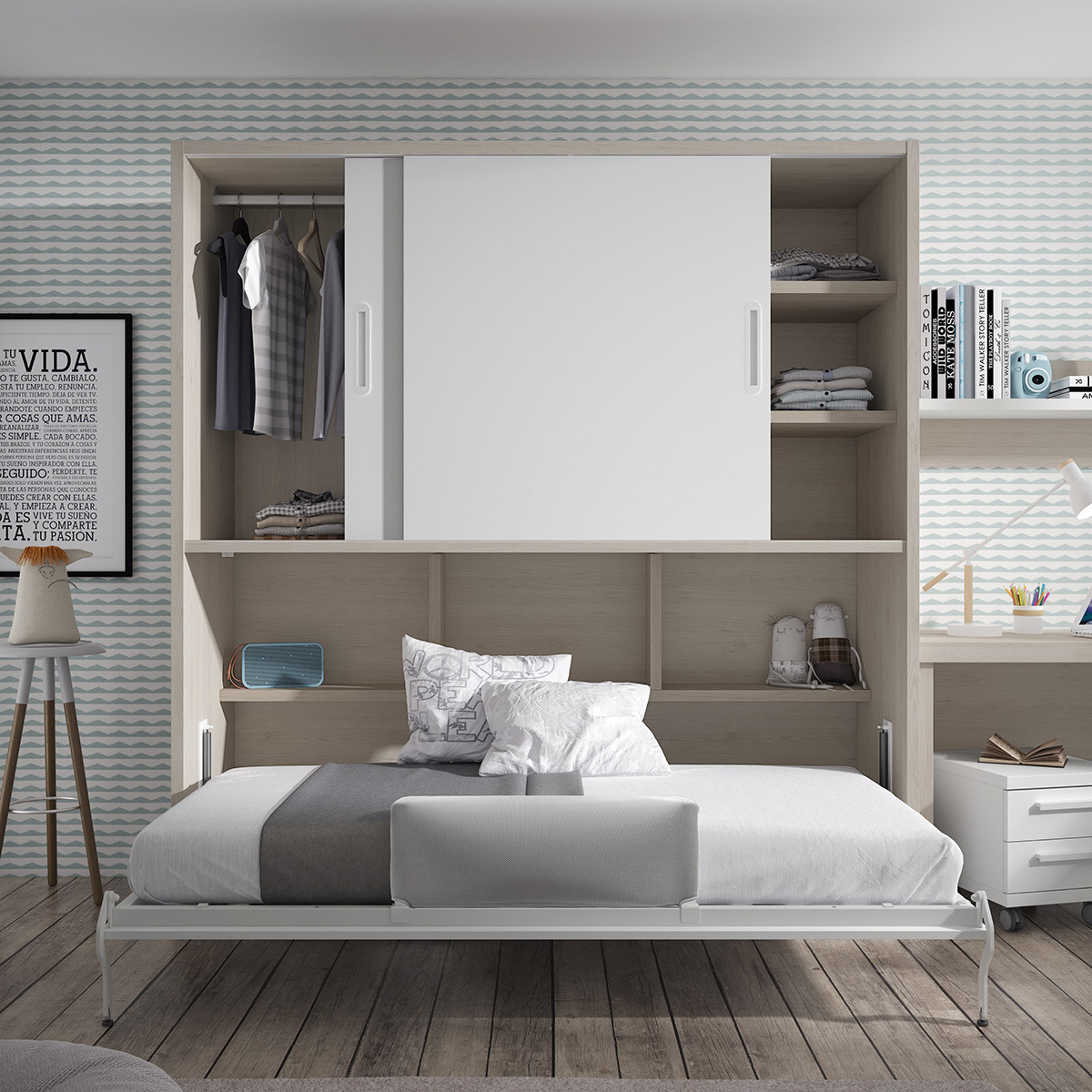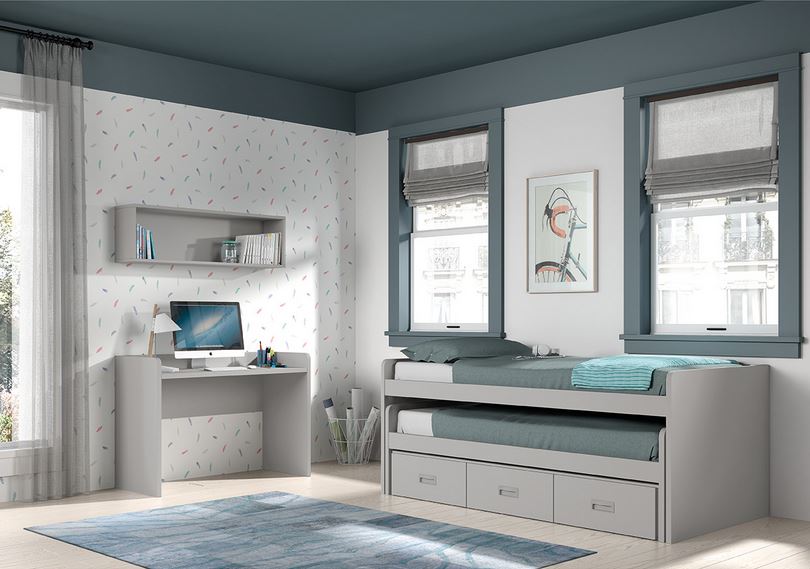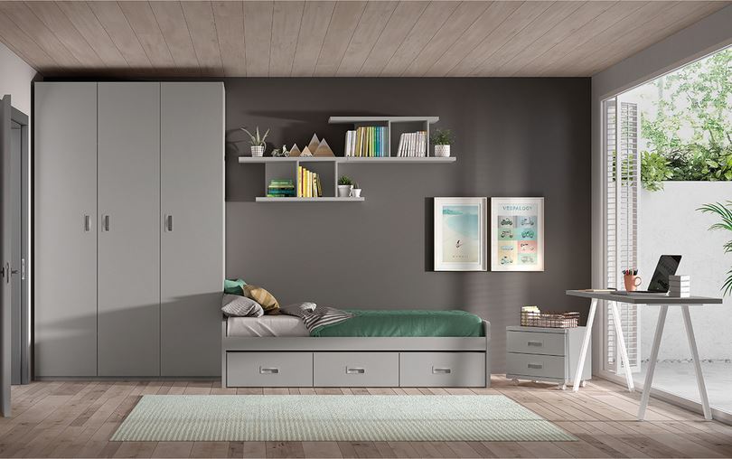 5. Dormitorio juvenil Play con cama compacta: las camas abatibles son la solución perfecta para habitaciones con poco espacio. Durante el día estas camas se pueden plegar y así queda más superficie para moverse. En concreto la cama Play incorpora puertas correderas en su parte superior que funcionan como un armario, lo que también ahorra espacio. Además se puede complementar con una mesita, estantes y escritorio de la misma colección.