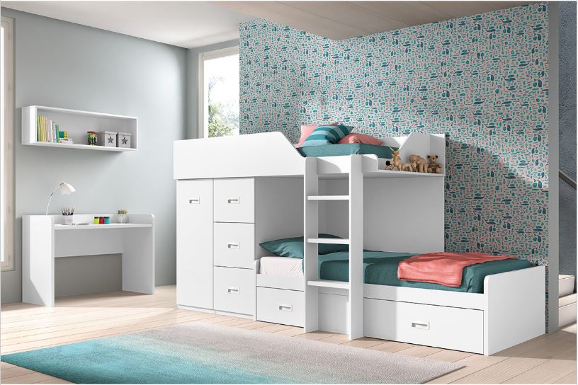 4. Dormitorio juvenil Planet con cama tren en blanco: otra opción para hermanos que comparten habitación es la cama tren. Su ventaja con respecto a la litera normal es el espacio de almacenaje que hay bajo ambas camas, que permite guardar una gran cantidad de cosas. Esta estructura se puede acompañar con un escritorio, un armario y un sifonier de la misma colección.