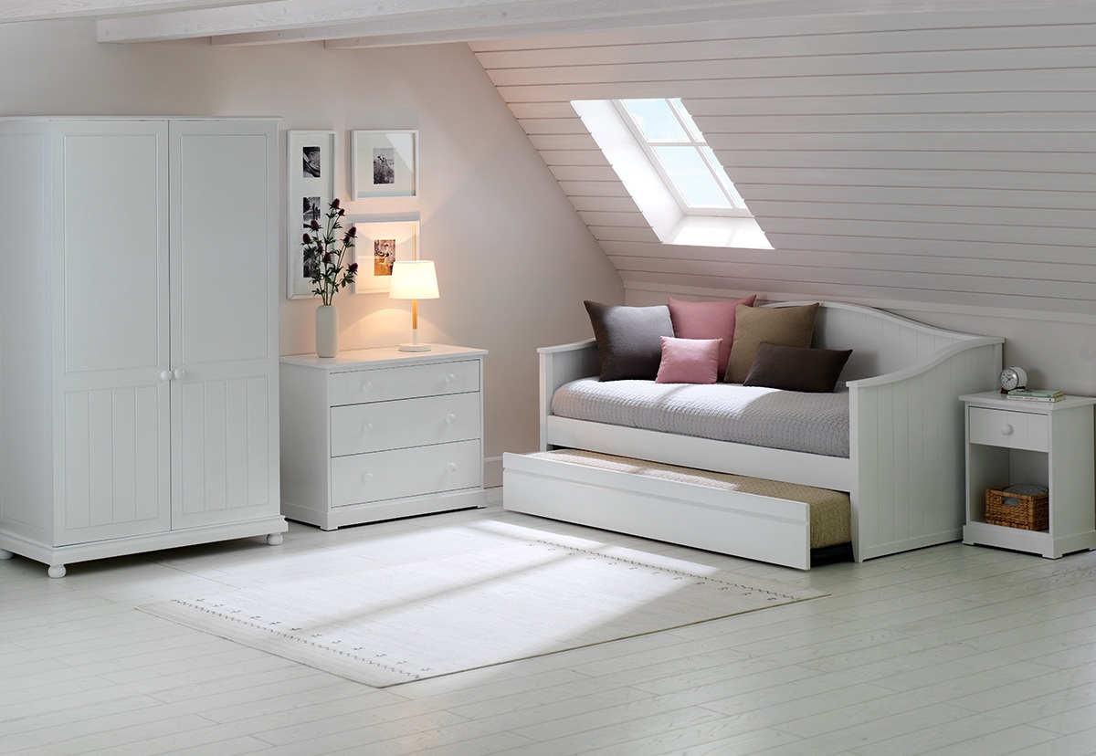 6. Dormitorio juvenil Albany: la línea Albany ofrece un estilo romántico y clásico a la habitaciones juveniles. Su pieza principal es una cama diván recta o curvada que durante el día puede tener aspecto de sofá. A la misma se puede añadir otro somier para convertirla en cama nido. También forman parte de la colección un clásico armario de dos puertas, una mesita de noche y una cómoda o sinfonier.