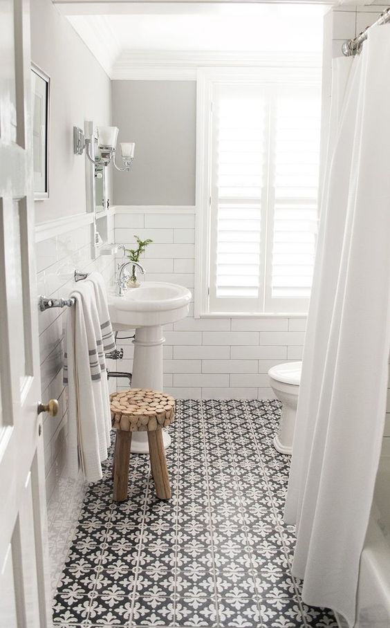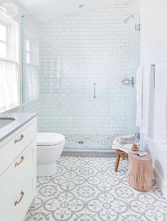 El baño es la segunda estancia por excelencia para decorar con baldosas hidráulicas, ya que son muy resistentes a la humedad, no se empañan, se secan rápido y se limpian con una simple pasada de fregona o bayeta. Al igual que con las cocinas, se suelen usar tanto en los suelos como en la pared como revestimiento. Una de las últimas tendencias es usar baldosas en una única pared o rincón del baño. Este recurso no solo sirve como decoración, sino que además abre el espacio y hace que el baño parezca más grande de lo que es.